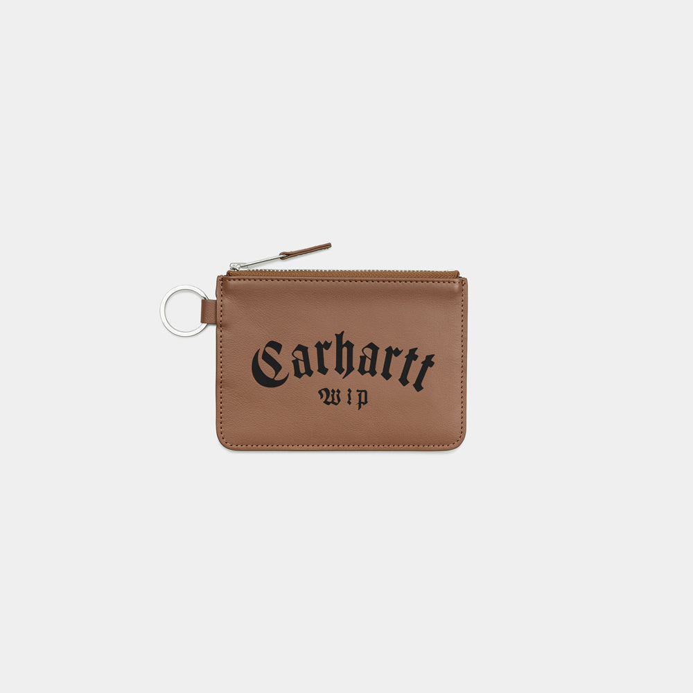 The Onyx Zip Wallet is made from leather and fully lined. It features a main zipped compartment and an additional patch pocket inside. Graphic lettering appears on the outside.