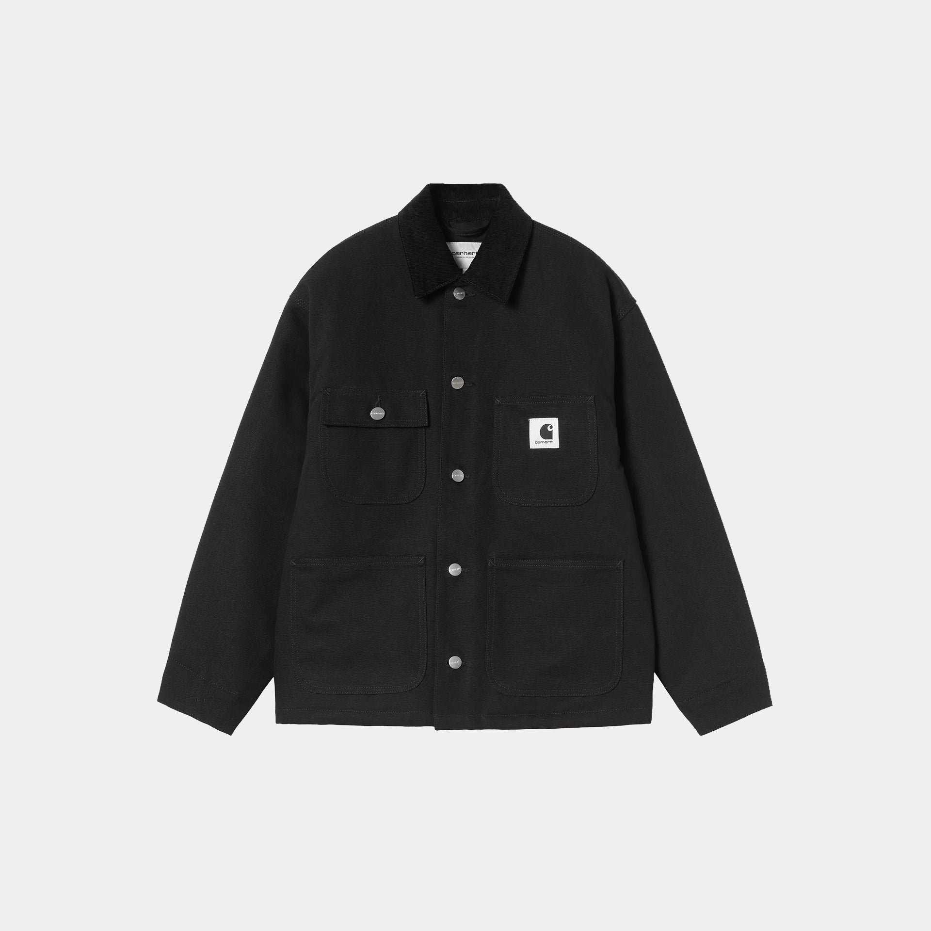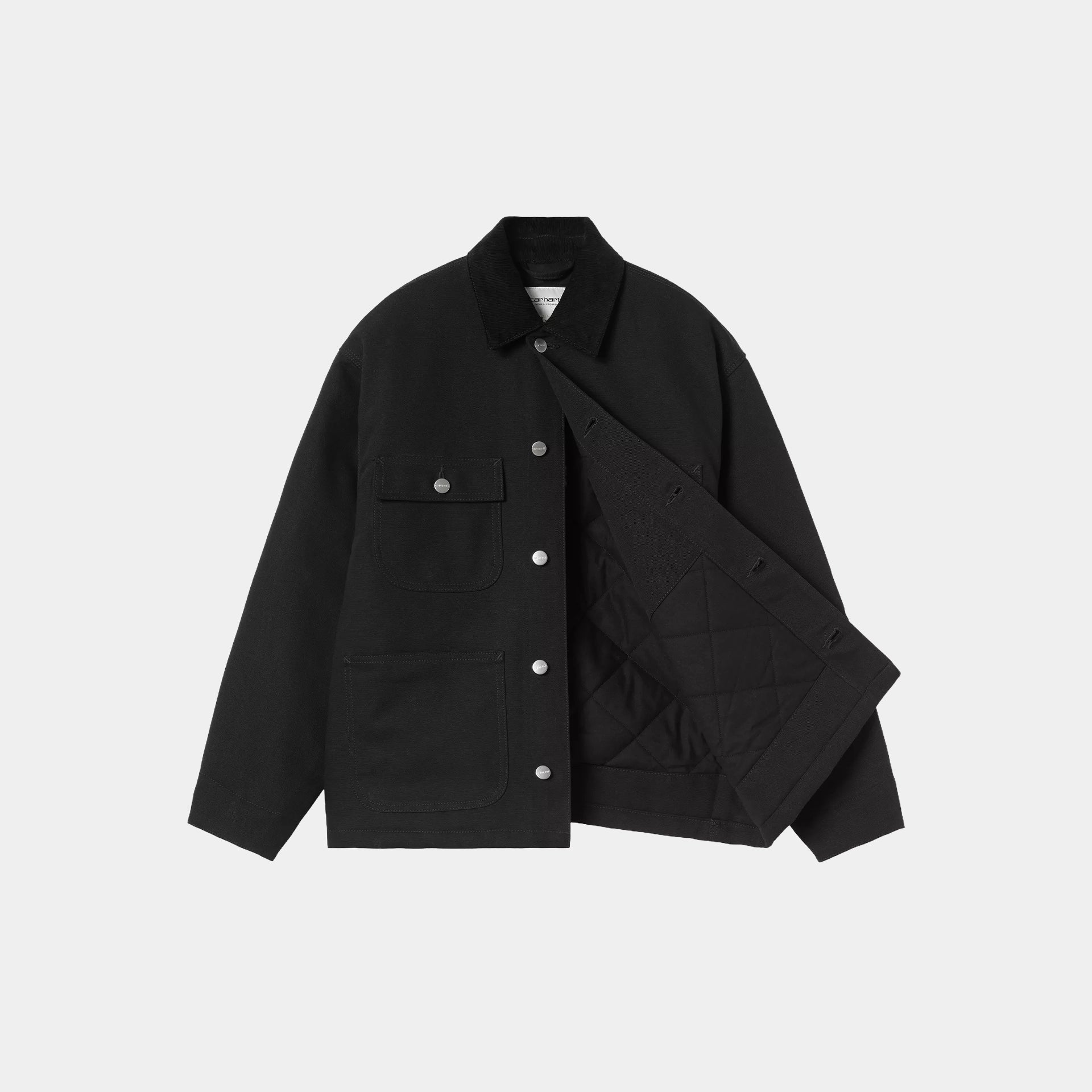 The Women's OG Michigan Coat is made from heavyweight cotton Dearborn Canvas with a diamond-quilted lining. The item is inspired by a classic chore coat silhouette and is cut in our original loose fit, which is a little boxier and oversize. Front patch pockets and a corduroy collar offer tactile touches, while triple stitch details provide extra durability. A woven Square Label completes the design.