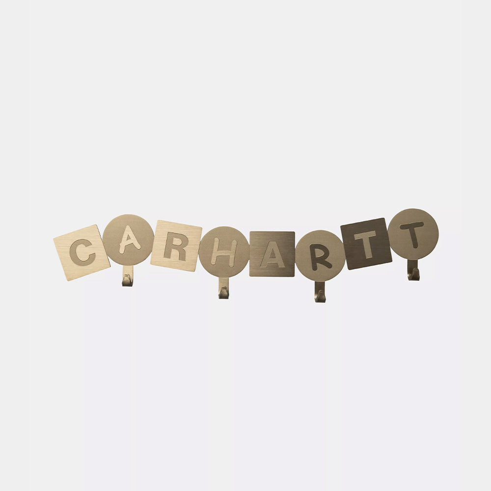 The ABC Wall Coat Hanger is made from stainless steel with gold-tone plating. The item is equipped with four hooks and features engraved lettering. Screws and dowels are included, which can be used to attach the hanger to the wall.