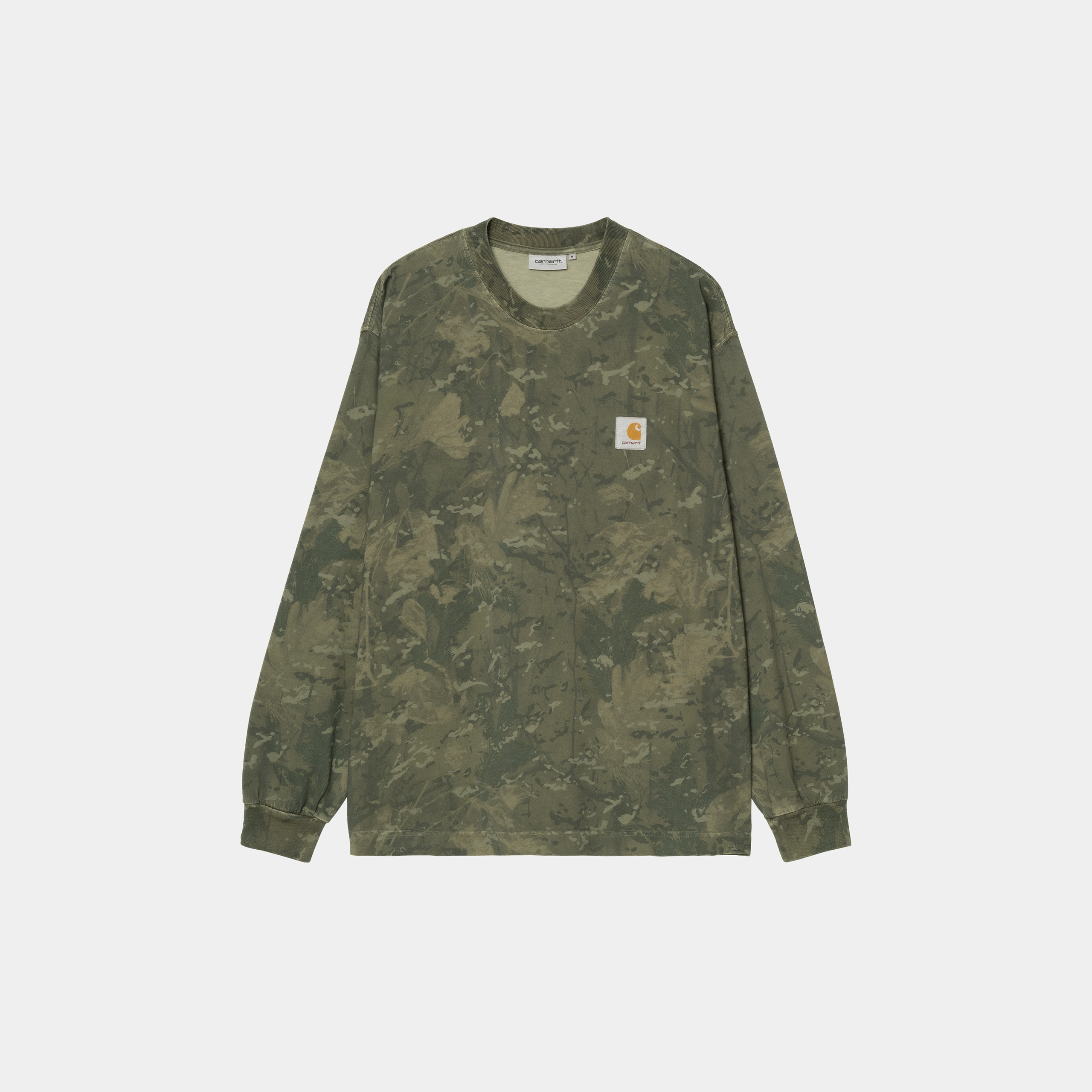 The L/S Camo Combi T-Shirt is made in a loose fit from a midweight organic cotton jersey, featuring an allover print. The item has been garment-dyed for a softer feel and complex color configuration. A woven Square Label appears on the chest.